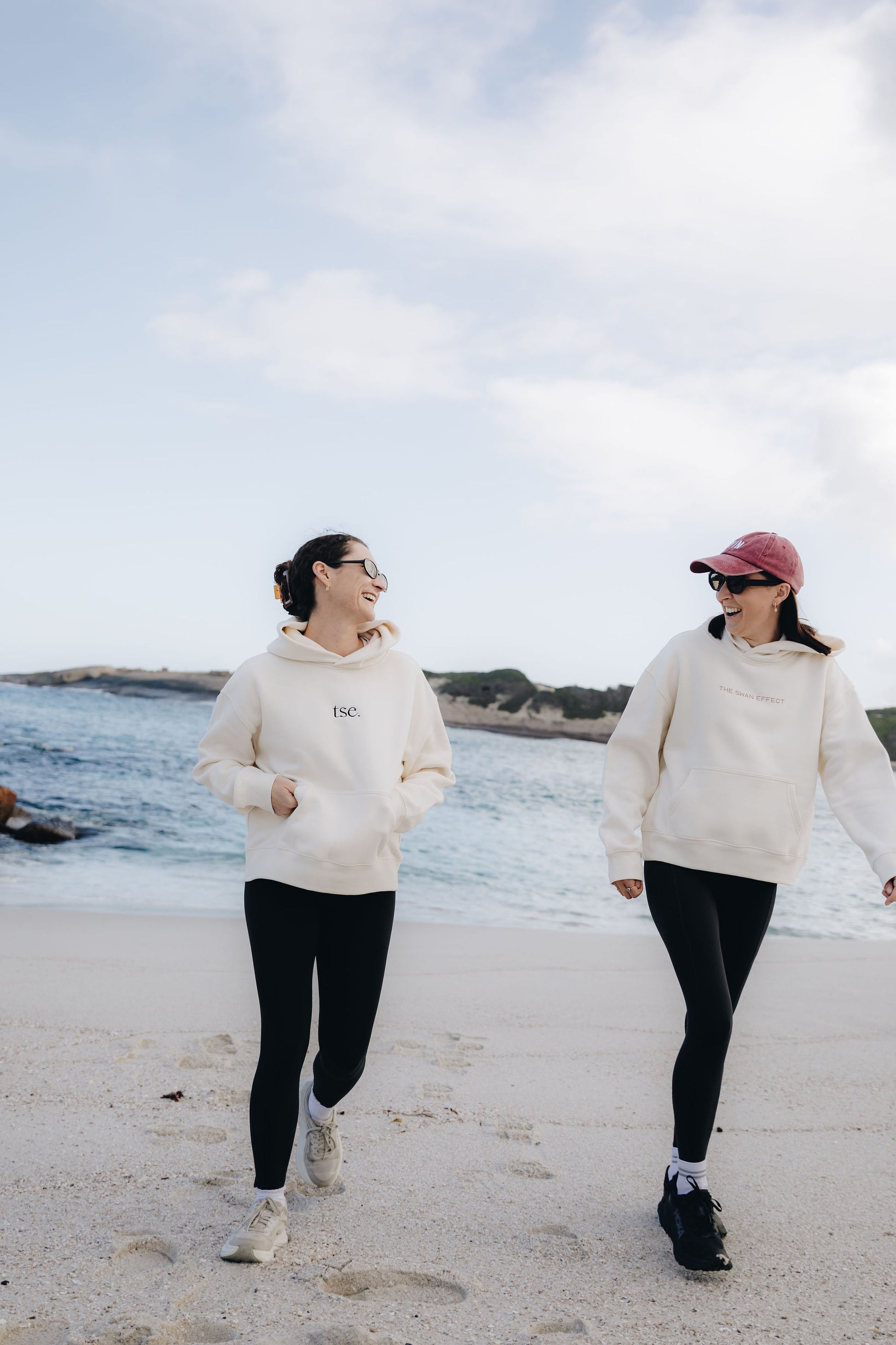 A staple of the base collection and your everyday wardrobe. This relaxed fit hoodie comes in calming sandstone with dusty pink printing on the front and back, as pictured.