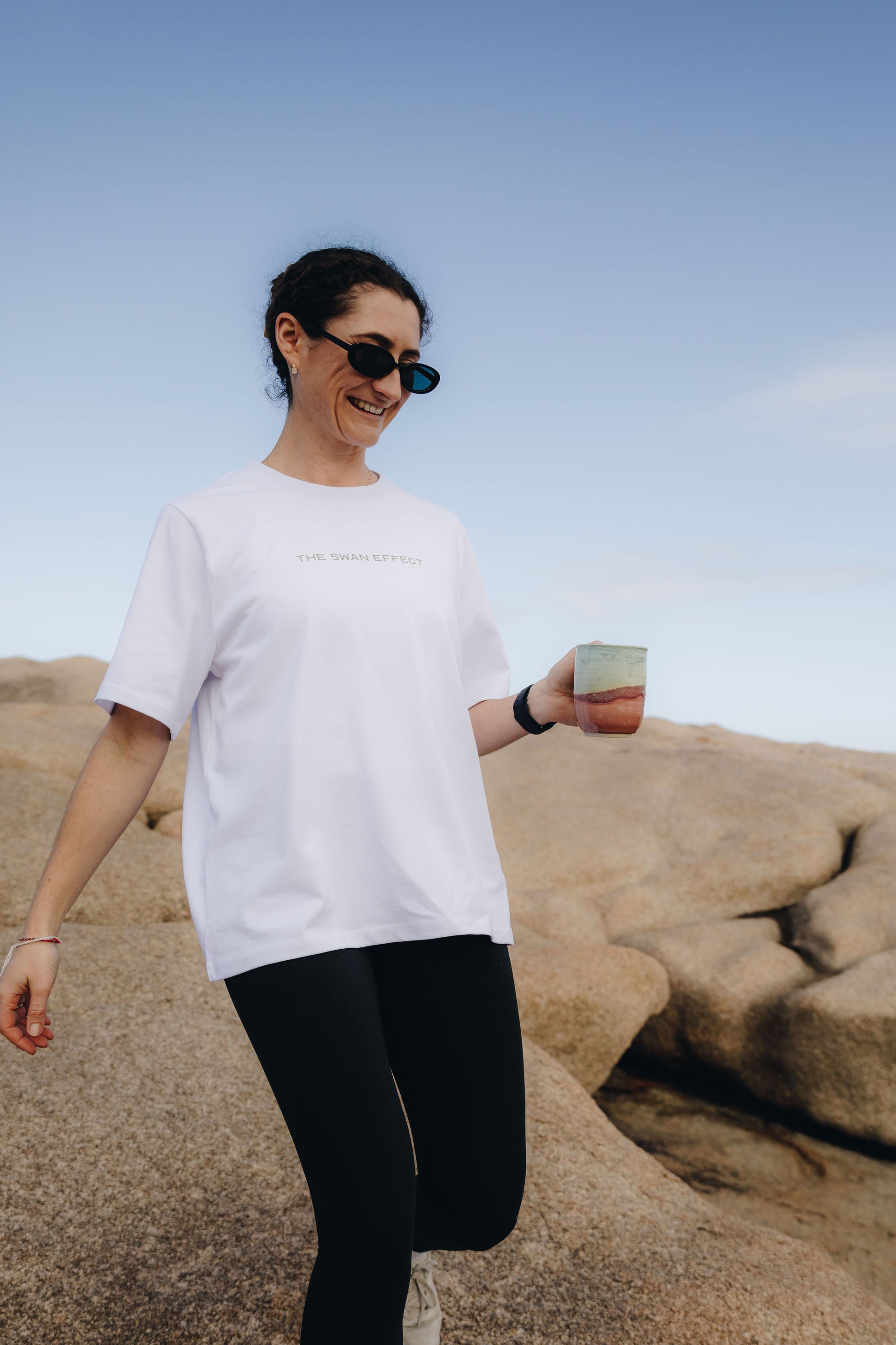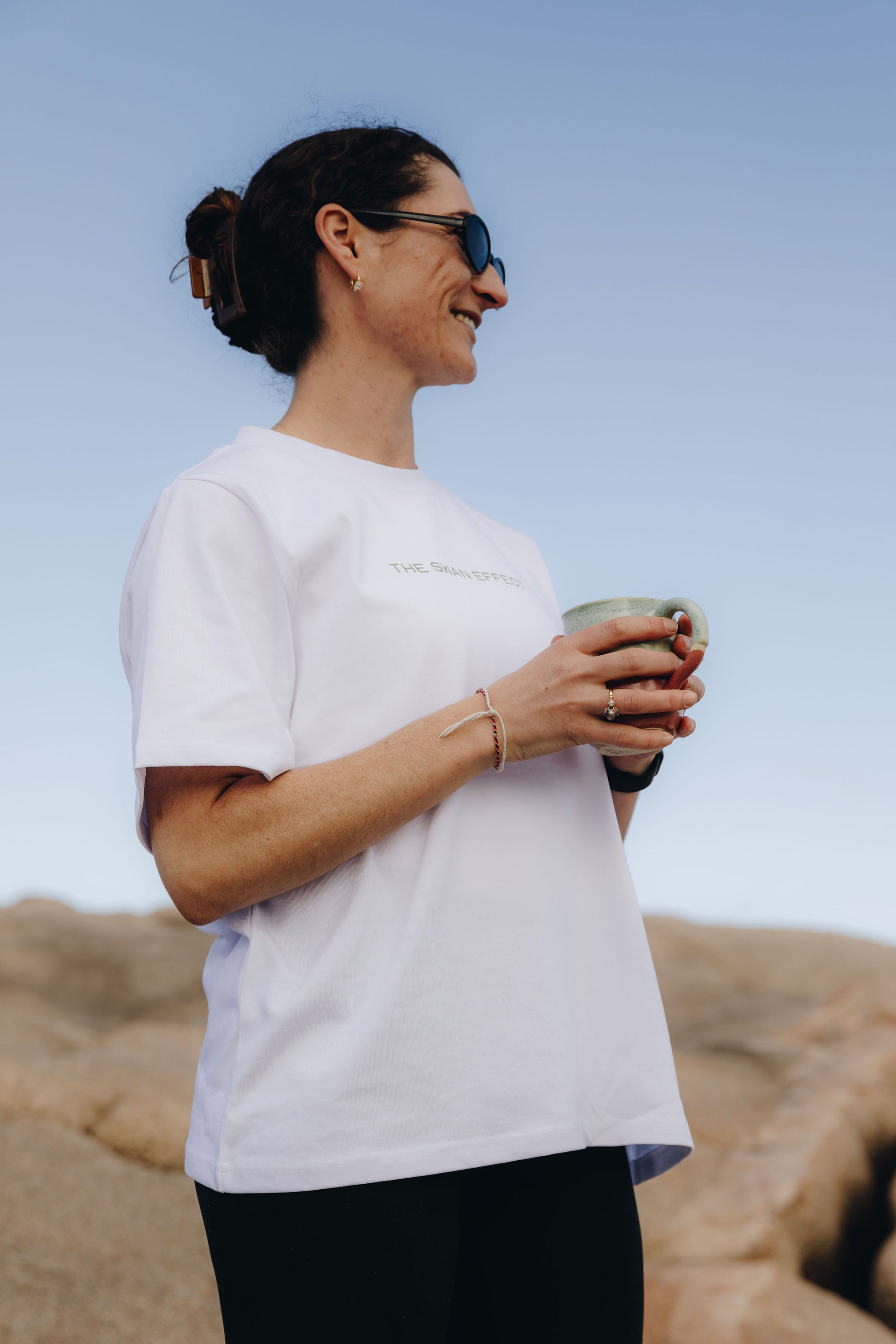 Oversized, box fit to take you from the studio to wherever you want to go. Pair it with your fave denim or over your onesie or sports bra. Take it off when we hit downward dog and then pop it back on for savasana, along with a TSE Hoodie and/or cozy studio blanket.
